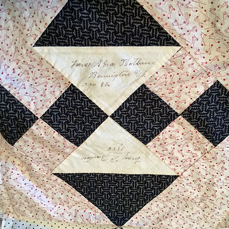 Historic 1888 Shaftsbury Signature QuiltQuilt Block #17 - Quilt Signers:![]() May P. Barton/ Mrs. Abia Bottum Bennington (Grand Niece and Grand Aunt)May/Mary P. Barton is the daughter of Myron and Abia Elizabeth (Fisk) Barton. When May/Mary's name was added to the quilt she would have been twenty-one years old. She married John G. (Grant) Huntington BLOCK: 31 in Shaftsbury on 16 December 1891, about three years after the quilt was signed. May/Mary was the grand niece of Mrs. Abia (Andrus) Bottum. Abia (Andrus ) Bottum and Freelove (Andrus) Fisk were sisters. Freelove named a daughter Abia Fisk. Abia Fisk marries Myron Burton and they name one of their daughters Mary P. Barton, hence the signers on this block are grand niece and grand aunt.John and Mary's marriage license was signed by her father, Myron Barton, as he was Shaftsbury's Town Clerk at that time. John was the son of Algernon Olin and Sarah Elizabeth (Niles) Huntington. John was also the brother of Rena and Sydney O. Huntington BLOCK: 16. Myron first marries Adeline Galusha, daughter of George and Lucy (Burnham) Galusha on 1 September 1846. They have one child together, Arthur Sedgewick Barton 17 April 1848. Adekine passes on 1 September 1849 five months after giving birth. Myron next marries Abie Bottum who was born in Shaftsbury 6 November 1825 and they have two girls, May P. Barton and Alice May (Barton) Bottum who signed this block. An 1880 Census shows May P. (12) living in Shaftsbury with her parents Myron (59) and Abi E. (47), and her grandfather, Hiram Barton (85). Another Census of 1880 shows her future husband John Grant (12) living in Shaftsbury with his parents Olin A. (43), Sarah H. (34) and siblings Alice S. (15), Mary G. (13), Sidney O. (8), Charles H. (5), and Irene Blanche (3). Another member of the household is John's uncle, Edward R. Huntington (48). In 1892 Mary and John have an infant child who passed at birth. They have no other children. When the census of 1900 was completed John (31) and Mary (32) were still living with Olin (62). The census of 1920 records A. Olin (82) as head of household and John (51) and May (52), daughter-in-law, living on “Cald (Cold) Spring” Road in Shaftsbury. John's occupation is arestianure (auctioneer). When the census of 1930 was taken John was one of 51 patients living at the Brattleboro Retreat. John died October 24, 1937 (age 69) at the Retreat, suffering chronic myocarditis and manic depressive psychosis (depression for 12 years). According to the Deer Field Valley Times, printed in Wilmington, VT on 29 October 1937, John Huntington enjoyed an excellent reputation as an auctioneer. He was in failing health after the death of his father in 1927. Mary died three years later on 16, January 1940 at the age of 72 years, 3 months, and 17 days. She passed three years after John. John is buried in the Center Shaftsbury Cemetery. Mary Parks (Barton) Huntington is buried in Center Shaftsbury Cemetery. Others buried in the Huntington family plot are John's parents Algeron Olin Huntington (1837-1925), and Sarah Elizabeth (Niles) Huntington (1845-1897), his thirteen year old brother Charles Henry (1873-1888) and Irene Blanche (Huntington) Bottum (1876-1913). His other siblings are found in different cemeteries. Alice (Huntington) Niles (1865-1957) in Elmwood Cemetery, Troy N.Y., Mary Grace (Huntington) Bottum (1866-1951) at Pleasant Hills Cemetery, Benedict NY, and Sidney Olin Huntington (1871-1907) in Oakwood Cemetery, Troy, NY. May P. Barton/ Mrs. Abia Bottum Bennington (Grand Niece and Grand Aunt)According to Find-a-grave, Mrs. Abia/Abiah (Andrus) Bottum was born 9 February 1803 to David Andrus/Andrews (1779-1861) and Mary (Parks)Andrus/Andrews (1787-1839). Abia marries Lemuel Bottom, the son of Simon and Margaret A. (Douglass) Bottum, on 4 May 1819 when she was sixteen years old. He was 19. Lemuel was the son of Simon and Elizabeth (Huntington) Bottum who were from Connecticut. Lemuel was born in Shaftsbury. The Federal Census of 1850 records Lemuel (50) and Abia (47) living in Shaftsbury with two of their four children, H.B. Bottum (22) and Edward (17). A daughter Mary Elizabeth had died at 15 in 1838 and a second daughter Caroline Amelia (Bottum) Douglas (1828-1919) is buried in a different family plot in Center Shaftsbury Cemetery. Also, in the 1850 Census were four other people included in the household count: Jeremiah Bowen (24) laborer, Michael Karnough (22) a laborer born in Ireland, Thomas Uvien (20) a laborer and Margaret Kelley (35) a servant who was from Ireland. Another member living in the house is Abiah/Abia/Abi E. Fisk (17). Abi Fisk is Abia Bottum's niece. She was the daughter of Abia's sister, Freelove (Andrus) and Turman Fisk. Freelove and her husband Truman Fisk had moved to Castile, New York which is about 300 miles from Shaftsbury. During the 1830's Castile grew rapidly and was famous for its Sanitarium also called the “Water Cure”. The Federal Census of 1850 lists Truman living in Castile with his second wife Phoebe A. (Stratton) Fisk as his first wife Freelove died 3 January 1841. In the census 1870 Truman is listed as a farmer. Perhaps, Truman and Freelove's move to Castile had been precipitated by her illness. Both she and Truman are buried in Hope Cemetery in Perry, New York. Abia Fisk marries Myron Barton. They in turn have a daughter May P. Barton who marries John G. Huntington. Abia Bottum had seven siblings: Freelove (Andrus) Fisk (13 June 1807- 3 January 1841), Oretta (Andrus) Huntington (1805-1859), John Parks Andrus (1808-1829), Martin Andrus (1811-1892), Horatio Nelson Andrus (1813-1859), Columbus Parks Andrus (1822-1907), and David Oatman Andrus (1825-1909). Lemuel had two siblings: Nathan Huntington Bottum (1793-1855) and Elizabeth (Bottum) Galusha (1796-1880). The Census of 1880 records Lemuel (79) living in Shaftsbury with Abia (77). It documents him as being sick with paralysis. Lemuel dies on 14 July 1880 at the age of 79 from Apople