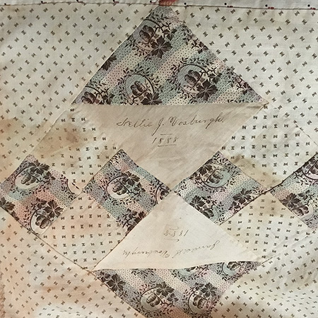 James S. meets and marries Nellie J. Galusha in Shaftsbury on 24 September 1885. Nellie was the daughter of Augustus and Polly (Chandler) Galusha. (BLOCK #10). James and Nellie's wedding was quite the event in Shaftsbury. A reporter from the Bennington Banner reported it as a “Brilliant Wedding”. “Some seventy invited guests, representing the intelligence, beauty and wealth of local society with similar representatives from Arlington, Bennington and adjoining towns assembled in the morning at the pleasant home of Deacon Augustus Galusha and family.” When the quilt was signed Nellie would have been about 23 and James was 29.