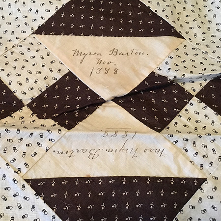 Historic 1888 Shaftsbury Signature QuiltQuilt Block #25 - Quilt Signers:![]() Myron Barton/Mrs. Myron Barton (husband and wife) Myron Barton was the son of Hiram and Lucy (Howlett) Barton. He was born in Shaftsbury 17 April 1821. His first wife was Adaline S. (Galusha) Barton was the daughter of George and Lucy (Burnham) Galusha. Adeline was born 6 November 1825. Myron and Adeline marry 1 September 1846. They had one child, Arthur Sedgwick Barton (1848-1897). He was born 17 April 1848. Adeline passed away 1 June 1849 a little more than one year after Arthur was born. Arthur dies at the age of 47 from pneumonia. According to the census of 1850 Abiah/Abia Fisk (18) is living with her Uncle Lemuel (50) and Aunt Abiah E. (47) Bottum. Abia (18) was the daughter of Truman and Freelove (Andrus) Fisk. Freelove (Andrus) Fisk and Abia (Andrus) Bottum (47) were sisters. Truman and Freelove had moved to Castile, New York which is about 300 miles from Shaftsbury. During the 1830's Castile grew rapidly and was famous for its Sanitarium also called the “Water Cure”. It is assumed they moved there because Abia's (18) mother, Freelove was ill. Abia (18) wanted to stay in Shaftsbury for her upcoming nuptials to Myron Barton. Also, in the 1850's census are her cousins, H. B. Bottum (22) and Edward (17). There were four hired laborers included in the count as Lemuel's large farm required much help. On 10 September 1850 Abi E. Fisk marries Myron Barton. It is assumed she helps raise Myron's son, Arthur. She and Myron have two children together; Alice May (Barton) Bottum (1857-1922) and Mary/May Parks (Barton) Huntington (1867-1940). The Federal Census of 1870 records Myron (49) living in Shaftsbury with his wife Eliza AKA Abia Elizabeth Barton (38) and three children; Arthur (22), Alice (13) and Mary (3). Also, in the household are Helen Turner (23), a domestic servant, and John Quinn (16), a farm laborer. The Census of 1880 reports Myron (59) and Abi E. (47) are taking care of Myron's father, Hiram (85). Their oldest daughter May P. Barton is 12. May P. shares BLOCK: 17 with her Grand Aunt Mrs. Abia Bottum. May P. eventually marries John Huntington BLOCK: 31. When the quilt was signed in1888 Abia would have been 56 and Myron were married for 38 years. By the Census of 1900 Myron (79) and Aba (67) were raising their grandchildren Eliza A. Barton (23) and Arthur M. Barton (12), children of Arthur S. and Emma (Hawkins) Barton. Arthur S. died in 1897 and Emma lives to the age of 62. It unknown why her children did not stay with her after Arthur's death. She and Arthur are buried together in Center Shaftsbury Cemetery. Myron Barton died 30 June 1903 from a Cerebral Tumor. He was 82 years old. Abia died 24 September 1912 of Apoplexy (sudden loss of consciousness from a ruptured blood vessel causing lack of oxygen lack to the brain, now commonly referred to as a stroke) at the age of 80 years, 3 months and 15 days. Both Myron, Adaline S., and Abi are buried in Center Shaftsbury Cemetery. Their three children are also in Center Shaftsbury but in different plots with their own spouses and children. Please review BLOCK: 17 for the biography of Mrs. Abiah Bottum. That biography includes a brief history of the the family name of "Abiah/Abia". It appears to be a well loved, respected and often used in the lineage of the Andrus/Andrews family. One of the first "Abiah's" was born in Tisbury, Massachusetts 22 September 1693. |