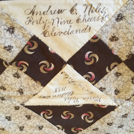 The slogans added to their quilt block showed Andrew's support for the Democratic Presidential candidate, Grover Cleveland. Most Vermonters, at this time in history, were Republicans. Maria, thought the Prohibitionist Party choice, Clinton Fisk, would reinforce her stance for temperance. Neither of their preferred candidates won and the Republican candidate Benjamin Harrison was sworn into office January 1889.