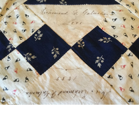 Mr. Richmond F Galusha was the son of Jonas (1803-1871) and Elizabeth/Eliza (Fisk) Galusha (1802-1877). This Jonas Galusha was not a governor of Vermont but, was a cousin to the Governor. Richmond was born 5 February 1830. When the quilt was signed in 1888 Mary and Richmond were both 58.